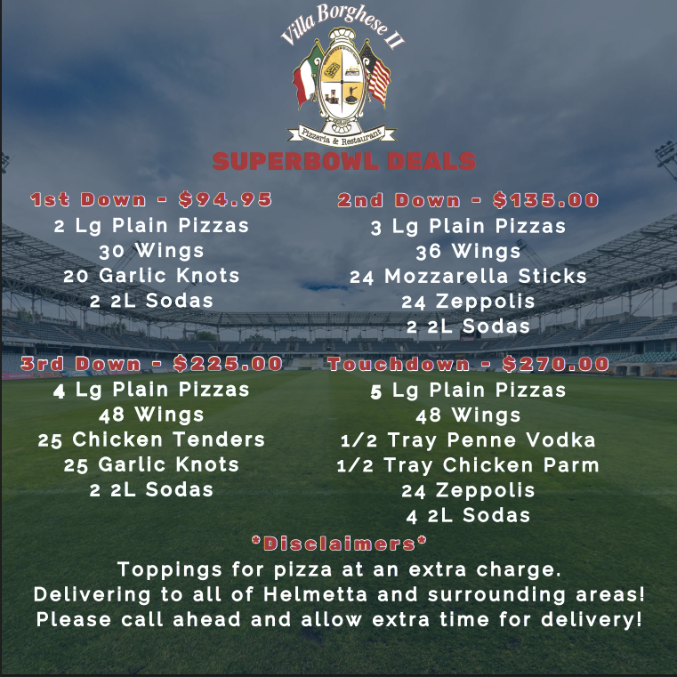 🏈Big Game Deals Are Here | Villa Borghese II Get ready for kickoff with our Super Bowl Deals — perfect for game day with family and friends! 🍕🏈